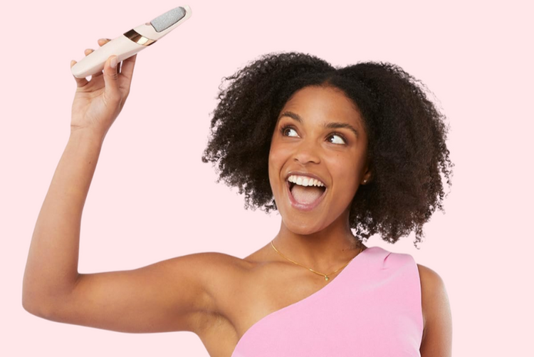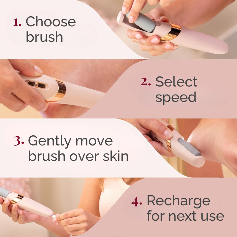 It uses a rotating abrasive head to gently buff away dead skin and calluses, revealing smoother, healthier feet.